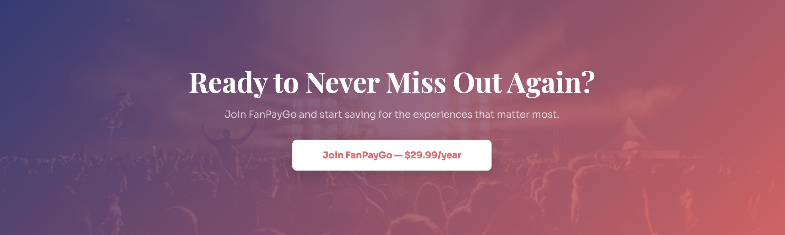 We're here to change that. FanPayGo gives every fan the power to save, budget, and pay for live experiences on their own terms — so no one has to miss out because the timing wasn't right.